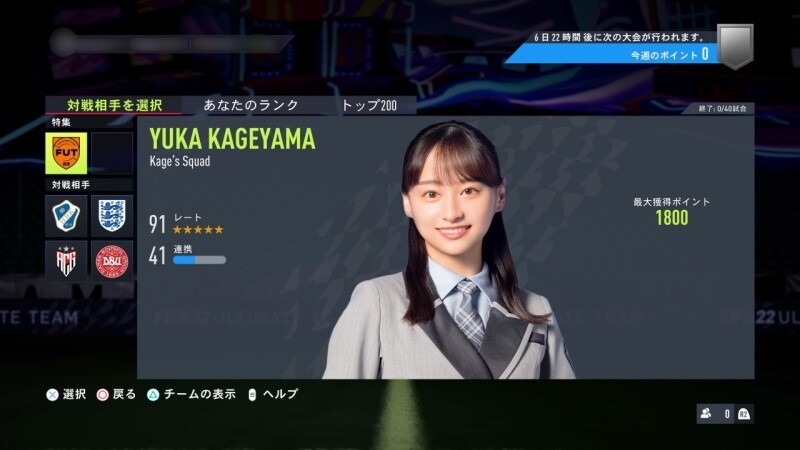 EA SPORTS™公式サッカーゲーム「FIFA 22」のゲームモード「Ultimate Team」にて影山優佳考案のチーム「Kage’s Squad」と対戦可能になりました。「Ultimate Team」はユーザーがゲーム内コインを使って選手を獲得し、“究極のチーム”を目指すモード、「スカッドバトル」はCPUチームと対戦する対戦機能です。