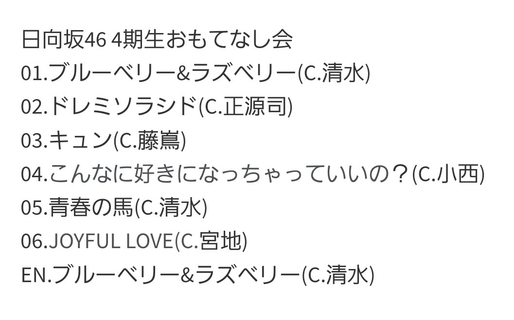 (センター、両サイド)★ドレミ C正源司、竹内、渡辺★キュン C藤嶌 (可愛い)、正源司(好きだよ)、山下★こん好き C小西、平尾、岸★青春の馬 C清水、石塚、山下、ひよたん役は福岡の後輩りなし★ジョイラ C宮地、平岡、藤嶌(EC)★ブルラズ(2回目)